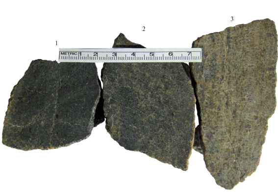 Приполированные образцы из зоны контакта мафических кристаллосланцев (1) c лейкоплагиогнейсами (3) и полосы переходных пород (2). 1 – двупироксеновые кристаллосланцы (пр. 607, TNd(DM) = 3.65 млрд лет), 2 – контаминированные двупироксеновые гнейсы (пр. 607А, TNd(DM) = 3.67 млрд лет); 3 – ортопироксеновые лейкоплагиогнейсы (пр. 607В, TNd(DM) = = 3.47 млрд лет).