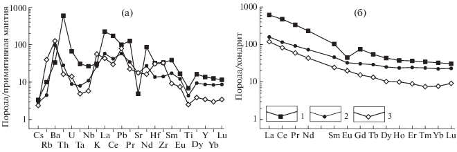 Мультиэлементные диаграммы для гранулитов. 1 – двупироксеновые кристаллосланцы (пр. 607), 2 – контаминированные двупироксеновые гнейсы (пр. 607А); 3 – ортопироксеновые лейкоплагиогнейсы (пр. 607В). Нормализация содержаний проведена на состав примитивной мантии и хондрита по (Sun, McDonough, 1989).