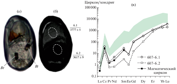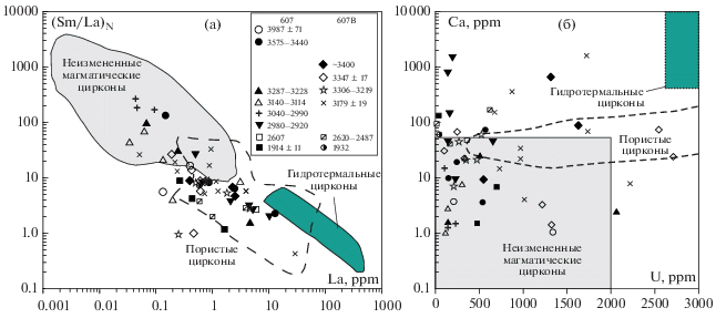 Анализ редких элементов в цирконе выполнен методом масс-спектрометрии вторичных ионов на ионном микозонде Cameca IMS-4f в Ярославском филиале Физико-технологического института РАН, процедура исследования приведена в работе (Федотова и др., 2008). Точность определения составляет <10% для содержаний элементов более 0.1 ppm и 30–50% при концентрациях менее 0.1 ppm.