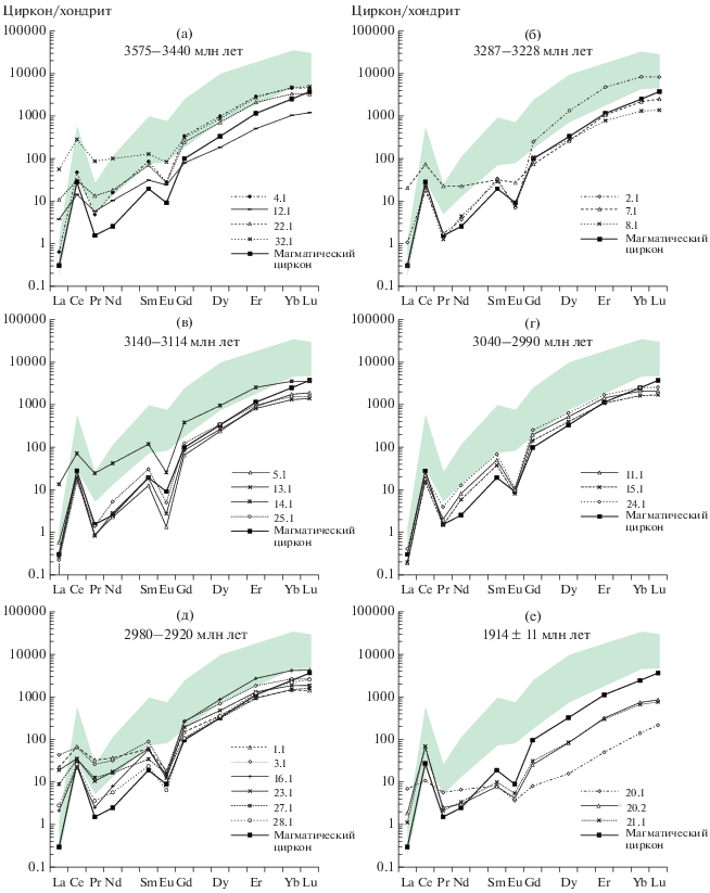 В цирконе с возрастом 3287 млн лет и менее Hf-модельный возраст THf(DM) заметно моложе, в основном он палеоархейский (3585–3448 млн лет) и в двух случаях – эоархейский (3716–3718 млн лет). В палео- и мезоархейском цирконе (менее 3287 млн лет) преобладающий возраст экстракции коры – эоархейский > 3.6 млрд лет, хадейские значения получены в зерне в точке анализа 13.1 из популяции циркона с конкордантным возрастом 3125 ± ± 16 млн лет, а также в зернах с дискордантными значениями 2713 и 2410 млн лет.