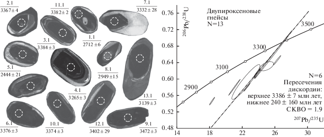 Контамированные двупироксеновые гнейсы по большинству элементов имеют геохимические характеристики, промежуточные между мафическими ксенолитами и лейкоплагиогнейсами. На спайдерграммах (рис. 3) спектр двупироксеновых гнейсов конформен и приближен к плагиогнейсовому, отмечаются различия только в содержаниях Zr (положительная аномалия в плагиогнейсах и наиболее низкое содержание в двупироксеновых гнейсах) и REE, которые в 1.5 раза выше, чем в плагиогнейсах, при менее фракционированном распределении (La/Yb)N = 6.8. Циркон из контаминированных гнейсов сходен с таковым из лейкоплагиогнейсов. В CL-изображении он тоже черный и однородный, что характерно для циркона анатектических пород. Присутствуют ядра с низким отношением Th/U = 0.04–0.08, характерным для метаморфического циркона. Возраст циркона в контаминированных гнейсах по верхнему пересечению линии дискордии (3386 ± 7 млн лет) близок к возрасту анатектического циркона в лейкоплагиогнейсах. Однако двупироксеновые гнейсы имеют Nd-модельный возраст протолита TNd(DM) = = 3.67 млрд лет, такой же как у мафических кристаллосланцев TNd(DM) = 3.65. Можно предположить, что мафические интрузии внедрились в анатектические гранитоиды и были контаминированы гранитоидным материалом. Следует отметить, что в контаминированных разностях не установлен древний циркон, присутствующий в мафических кристаллосланцах.