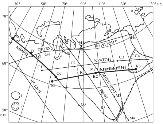 Схема сверхдлинных сейсмических профилей, отработанных с ядерными взрывами. Утолщенными линиями показан профили “Кварц” и “Кимберлит”, по которым на рис. 2 приведены сейсмические разрезы. На всех профилях дано их название и отмечено местоположение отработанных ядерных взрывов (буквами даны их названия). Контуры: 1 – Сибирского кратона, 2 – Вилюйской впадины.