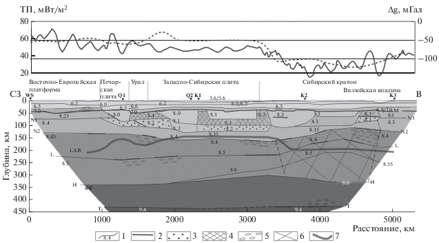 Сводный скоростной разрез по профилям “Кварц” и “Кимберлит”, пересекающим Восточно-Европейскую, Западно-Сибирскую и Сибирскую платформы от Балтийского щита до Вилюйской впадины (Павленкова Н.И., Павленкова Г.А., 2014). 1 – границы слоев с разными скоростями продольных волн (км/с), 2 – отражающие площадки, 3 – слои пониженной скорости, 4 – высокоскоростные блоки, 5 – области высокой гетерогенности верхней мантии, 6 – область пониженной на 0.03–0.05 г/см3 плотности в литосфере Сибирского кратона, определенной по гравиметрическим данным (Егорова, Павленкова, 2015), 7 – глубина до границы литосфера–астеносфера (LAB – lithosphere-asthenosphere boundary), определенная по тепловому потоку (Artemieva, Mooney, 2001). WS, Q1, Q2, K1–K3 – местоположение отработанных ядерных взрывов; M – подошва земной коры, N1, N2, L, Н – сейсмические границы в верхней мантии, T – кровля переходной зоны к нижней мантии. Геофизические поля: ТП – тепловой поток (мВт/м2), ∆g – аномалии Буге (мГал). Условные обозначения к верхнему рисунку: пунктирная линия — тепловой поток, сплошная — гравитационное поле.