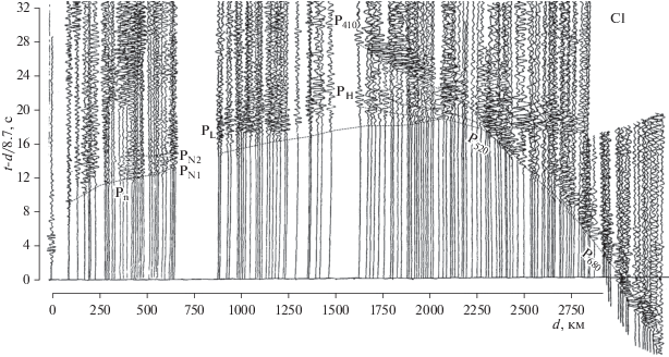 Монтаж сейсмограмм, записанных вдоль профиля “Кратон” от ядерного взрыва в точке С1 (рис. 1). Монтаж представлен в редуцированном виде, при котором из наблюдаемого времени t (с) вычтена величина расстояния от взрыва d (км), деленная на скорость редукции 8.7 км/с. Pn – преломленные волны в верхах мантии (от границы М), PN1, PN2, PL PH – отраженные волны от границ N1, N2, L и H в верхней мантии, P410, P520, P680 – волны от границ переходной зоны между верхней и нижней мантией на соответствующих глубинах.