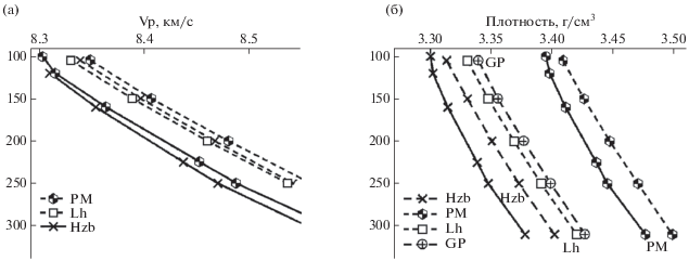 Графики изменения физических параметров мантийных пород с глубиной: Vp – cкорость продольных волн (а) и плотность (б) для гранатового гарцбургита (Hzb), лерцолита (Lh), гранатового перидотита среднего состава (GP) и фертильного вещества примитивной мантии (PM), рассчитанные вдоль геотерм 35 мВт/м2 (пунктир) и 50 мВт/м2 (сплошные линии) (Кусков и др., 2014).