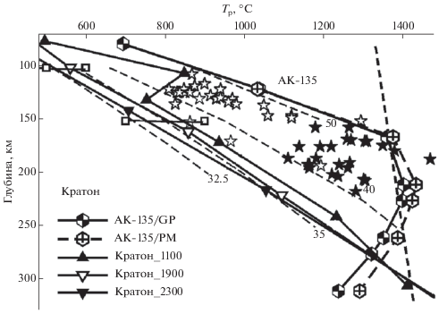 Распределение температур в верхней мантии под Сибирским кратоном, восстановленное по сейсмическим моделям вдоль профиля “Кратон” для трех точек профиля 1100, 1900 и 2300 для состава гранатового перидотита (GP) (Кусков и др., 2014). Залитые и незалитые звезды – равновесные Р-Т параметры для низко- и высокотемпературных ксенолитов (Глебовицкий и др., 2001; Ionov et al., 2010). Штриховая линия – мантийная адиабата с потенциальной температурой 1300°C. AK-135/GP ‒ осредненная континентальная геотерма, определенная по референтной сейсмологической модели АК-135 для перидотитовой мантии, AK-135/PM – для примитивной мантии. Тонкие штриховые линии – кондуктивные геотермы для тепловых потоков от 32.5 до 50 мВт/м2.