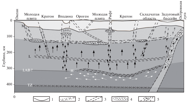 Модель адвекции глубинных флюидов в верхней мантии. 1 – контуры консолидированной земной коры, 2 – сложно расслоенные сейсмические границы, 3 – глубинные нарушения, разломы, 4 – слои пониженных скоростей (волноводы), 5 – фокальная зона глубоких землетрясений, LAB – возможная подошва литосферы, TZ – кровля переходной зоны между верхней и нижней мантией. Более темными оттенками показано увеличение добротности вещества верхней мантии в трех ее основных слоях.