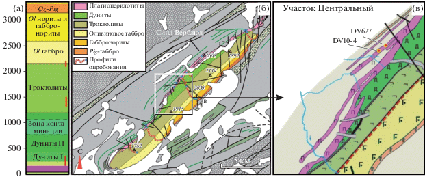 Геологическое строение Йоко-Довыренского массива и точки опробования пород с глобулярными сульфидами. (а, б) – по данным (Ariskin et al., 2018a), (в) – центральный участок интрузива, по данным (Орсоев и др., 2018) с дополнениями. Нижняя зона осложнена наличием подстилающих плагиоперидотитовых силлов/апофизов, включающих рассеянную минерализацию и сульфидные руды, с которыми ассоциируют проявления пород с сульфидными каплями (точки DV10-4 и DV627).