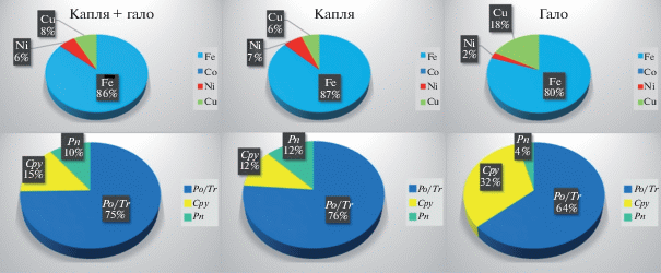 Химический и минеральный состав сульфидной глобулы, центральной капли и гало. Содержания Fe, Ni и Cu нормированы на сумму основных металлов в сульфидном веществе.
