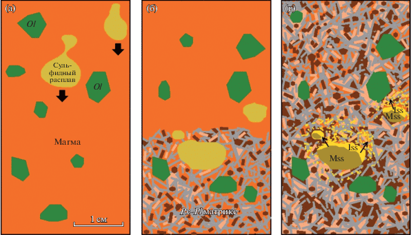 Интересен тот факт, что все сульфидные капли в образце находятся в одной плоскости (рис. 5в). Учитывая то, что она совпадает с плоскостью уплощения сфероидальных капель (рис. 5в), такую поверхность можно интерпретировать как маркер фронта кристаллизации породы, ниже которого направленная вниз миграция сульфидной жидкости была невозможна. Мы допускаем, что подобное наложение транспортных явлений на фронт кристаллизации носило собирательный характер, способствуя агломерации мелких капель и перколирующих сульфидов в более крупные глобулярные образования. Предложенная схема формирования глобулярных образований в пиродолеритах изображена на рис. 11: в расплав с интрателлурическими кристаллами оливина вблизи контакта магматической камеры Довырена прибывают капельки и глобулы сульфидной жидкости, которые были сегрегированы из вышележащего объема магмы при достижении насыщения серой и при сульфидной ликвации (рис. 11а). Затем при достижении восходящего фронта в результате быстрой кристаллизации магмы от контакта они захватываются тонкозернистой силикатной матрицей, кристаллизующейся в виде лейст плагиоклаза и удлиненных кристаллов пироксенов (рис. 11б). Далее при кристаллизации Mss-раствора из протосульфидного расплава происходит частичная выжимка поздней медистой жидкости в поровое пространство породы, заполненное остаточным силикатным расплавом (рис. 11в). Судя по томографическим и минералогическим наблюдениям, такая миграция не превышала 0.5–0.6 см.