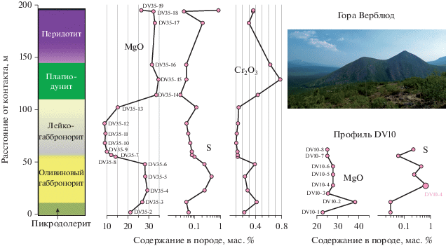 Для последующего рассмотрения важно, что вблизи нижнего эндоконтакта силла Верблюд, на стратиграфическом уровне примерно от 20 до 50 м нами установлена сульфидная минерализация. Аналогичное, но более значимое накопление сульфидов проявляется в основании другого силла или апофизы (профиль DV10), опробованного на удалении 3.5 км к юго-востоку от силла Верблюд в разведочной канаве, примерно в 200 м от выходов сетчатых сульфидных руд (рис. 1, 2). Именно в этом разрезе нами впервые обнаружены образцы оливиновых габброноритов с мелкими сульфидными каплями размером до 3–4 мм.
