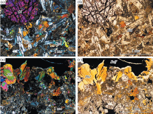 Структурные соотношения породообразующих минералов в пикродолерите-капельнике, обр. DV627-1-2. (а) – вкрапленник оливина (Ol) в основной оливин-пироксен-плагиоклазовой массе (Ol-Opx-Cpx-Pl), николи скрещенны, увеличение ×5; (б) – тот же участок, без анализатора; (в) – зерна флогопита (Phl) на границе с сульфидом (Sulf), николи скрещенны, увеличение ×5; (г) – тот же участок, без анализатора.