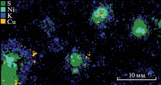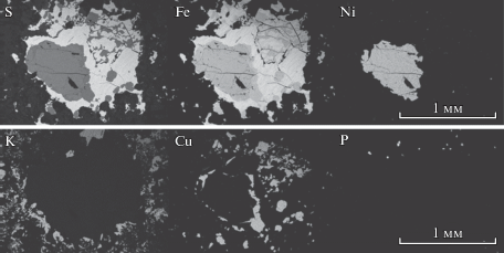 5. Расчеты пропорций сульфидных фаз и результаты изучения их состава на микрозонде (проводившиеся отдельно для гало и основной капли) позволили конкретизировать различия их валового химического состава: гало оказалось на 7.2 мас. % богаче медью и на 2.6 мас. % беднее никелем.