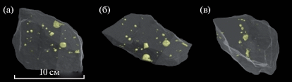 2. Методами рентгеновской компьютерной томографии в обр. DV627-1-2 было установлено 25 глобул диаметром от 2 до 15 мм, распределение которых в объеме породы носит планарный характер. Сами глобулы имеют форму сфероидов, сплющенных в направлении плоскости распределения капель, и окружены кольцеобразным гало из тонкой сульфидной вкрапленности, плоскость распределения которой также совпадает с плоскостью капельных образований.