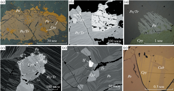 Далее рассмотрим особенности сульфидоносных пород из центральной части массива, где происходил отбор пород с глобулярными сульфидами (рис. 1б, 1в). В стратиграфическом разрезе Довырена мы выделяем четыре разновидности сингенетической минерализации малосульфидного типа, включая снизу вверх: (1) горизонт плагиодунитов с рассеянными сульфидами с преобладанием пентландита (Ariskin et al., 2016), (2) богатые (до 70–77%) халькопиритом и кубанитом ассоциации в нижней половине троктолитовой зоны (с ЭПГ-минерализацией), (3) главный платинометальный “риф”, также связанный с пентландит-пирротин-халькопиритовой (+кубанит) ассоциацией, приуроченный к зоне перехода от лейкотроктолитов к оливиновым габбро, и (4) горизонт относительно богатых сульфидами (местами до ~10 мас. %) безоливиновых габброноритов в пределах прикровельной зоны (Дистлер, Степин, 1993; Кислов, 1998; Ariskin et al., 2016, 2018а).