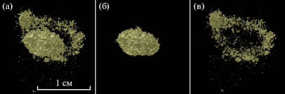 Пространственная структура крупной сульфидной капли по результатам КТ-съемки 10 мм керна, выбуренного из пикродолерита-капельника, обр. DV627-1-2. (а) – основная капля-сфероид + сульфидное гало; (б) – только сфероид, (в) – строение сульфидного гало с мелкой каплей.