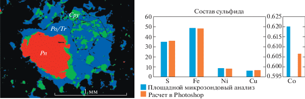 Наличие семи представительных сечений сульфидной капли позволило достаточно точно оценить состав всей капли в целом и состав исходной сульфидной жидкости в образце пикродолерита, постулируя закрытость системы в отношении сульфидного материала. Для оценки достоверности этого метода мы провели сравнение с точечным элементным картированием той же площади на электронном микроскопе. При пересчете обеих оценок на элементный состав сульфида их разница не превысила 1 мас. % для S, Fe, Ni и Cu. В случае Co эта разница оказалась почти в полтора раза выше, вероятно, за счет его малых концентраций в сульфидных минералах (рис. 9, справа).