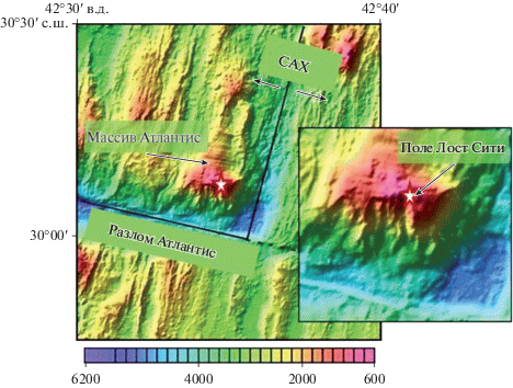 Гидротермальная активность на южном склоне подводного массива Атлантис (30° с.ш., Срединно-Атлантический хребт), связанная с серпентинизацией его ультраосновных пород, проявлена в виде гидротермального поля, получившего название Лост Сити (рис. 1). Радиоуглеродные датировки карбонатного материала построек этого поля варьируют от 25 тыс. лет до современных, а карбонатов в основании поля (пелагических известняков, цементов брекчий, прожилков в серпентинитах) – в интервале 25–34 тыс. лет (Früh-Green et al., 2003). Результаты геологического, геохимического и изотопного изучения гидротермального поля Лост Сити опубликованы в большом количестве работ (Kelley et al., 2001, 2005; Früh-Green et al., 2003, 2007; Леин и др., 2004; Дубинина и др., 2007; Foustoukos et al., 2008; Proskurowski et al., 2006, 2008; Boschi et al., 2008; Karson et al., 2006 и др.). Мы приводим только краткое его описание.