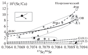 Основная часть образцов карбонатных построек (поле 3 на диаграмме рис. 2) соответствует линии равновесия арагонита с раствором, являющимся смесью ФЛС и ОВ. Отклонения точек вниз от этой линии связано с присутствием в образцах кальцита. Наиболее богаты стронцием образцы почти чистого арагонита – фрагменты кораллов и микробиального мата (поле 1 на рис. 2). Чистый неорганический арагонит расположен непосредственно на линии равновесия арагонита с придонной ОВ. Карбонатные цементы серпентинитовых брекчий, не являющиеся продуктом гидротермальной деятельности поля Лост Сити и сложенные преимущественно кальцитом с примесью глинистого материала, характеризуются значениями 103(Sr/Са), точно соответствующими таковым по экспериментальным данным (Gabitov, Watson, 2006) для кальцита (поле 2). Таким образом, положение карбонатов поля Лост Сити на данной диаграмме показывает, что изученные образцы не испытали серьезных диагенетических изменений, и отношение 87Sr/86Sr может быть использовано для расчета пропорции смешения ФЛС и ОВ.