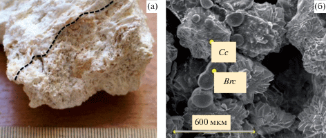 Образец из основания постройки Посейдон (обр. 4800-3): (а) – макрофотография зоны замедленной фильтрации флюида с меандровой структурой, c флюидными каналами и полостями, выполненными кристаллами кальцита, которая отделена пунктиром от зоны, сложенной плотным чешуйчатым агрегатом кальцита и арагонита; (б) – изображение в отраженных электронах одной из пустот, заполненных кристаллами кальцита с каплевидными выделениями брусита.