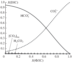 Величины δ18О(DIC) в гидротермальном растворе поля Лост Сити зависят от пропорций смешения ФЛС и ОВ, имеющих не только разные значения величины δ18О(Н2О), но и разные рН и Т, которые задают соотношение активностей частиц DIC в растворе (Zeebe, 1999, 2007; Millero et al., 2006 и др.). Поскольку между частицами DIC (прежде всего, между [HCO3]– и [CO3]2–) имеет место значительное изотопное фракционирование кислорода (Beck et al., 2005), в гидротермальном растворе неизбежно возникнут вариации величины δ18О(DIC). На рис. 4 показан расчет долей карбонатных частиц Х(DIC) в гидротермальном растворе для диапазона температуры и рН, задаваемых смешением ФЛС и ОВ (по модели Zeebe, 2007; Millero et al., 2006). При расчете использована стандартная соленость морской воды (35 е.п.с), и, поскольку концентрации Na, K и Cl в ФЛС близки к ОВ (Kelley et al., 2001), это приближение не является критичным. Расчет показывает, что во всем интервале смешения ФЛС и ОВ в гидротермальном растворе преобладают два вида карбонатных частиц – [HCO3]– и [CO3]2– (рис. 4). В равновесии с гидротермальным раствором поля Лост Сити значения величины δ18О растворенных частиц [HCO3]– и [CO3]2– и их взвешенной суммы (δ18О(DIC)) могут существенно варьировать (рис. 5), и при отсутствии локального равновесия карбонатов с водой раствора эти вариации будут унаследованы карбонатами построек поля Лост Сити. В области Х(ФЛС) → 0 значения величины δ18О(DIC) могут заметно превышать равновесные значения в системе карбонат–ОВ, а в области Х(ФЛС) → 1, напротив, оказаться заниженными относительно равновесия карбонатов с ФЛС.