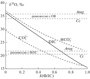 Изменение значений величины δ18О растворенных карбонатных частиц (карбонат- и бикарбонат-иона) и их взвешенной суммы (DIC) в зависимости от доли ФЛС в гидротермальном растворе (согласно уравнениям в (Beck et al., 2005)). При расчете использованы температура и рН крайних членов из табл. 4, δ18О(ФЛС) = 0.5‰. Горизонтальные пунктирные линии – равновесие карбонатных минералов (Сс, Arag) с ФЛС и с ОВ (согласно уравнениям в (Chacko, Deines, 2008)).