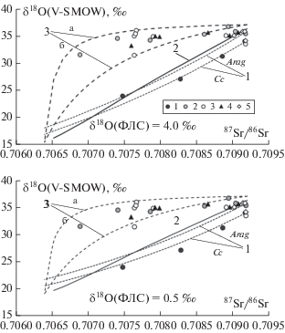 Сравнение расчетных и наблюдаемых изотопных характеристик карбонатов поля Лост Сити в координатах 87Sr/86Sr–δ18О. Верхний и нижний рисунки – варианты расчета для δ18О(ФЛС): 4 и 0.5‰ соответственно. Погрешность оценки δ18О(DIC) в ОВ (табл. 4) в масштабе рисунка незначима. Наблюдаемые изменения величин: δ18О (Сс, Arag) – линия 1 и δ18О (DIC) – линия 2, равновесных с гидротермальным раствором поля Лост Сити. Линия 3 – δ18О(DIC) для случая, когда DIC представлен смесью частиц, неравновесных с гидротермальным раствором: а и б – расчет для концентраций DIC в ФЛС – 0.1 и 0.7 µмоль/кг соответственно. 1 – основание постройки Посейдон (настоящая работа), 2 – вершина постройки Посейдон (Дубинина и др., 2007), 3 – фрагменты различных построек (настоящая работа), 4 – фрагменты различных построек (Früh-Green et al., 2003), 5 – другие карбонатные проявления – карбонатные маты, цемент брекчии и карбонатная корка в серпентинитах.