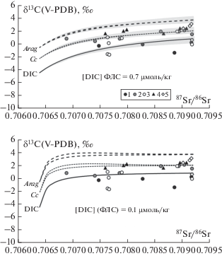 Основная часть данных для построек поля Лост Сити находится между расчетными линиями δ13С(DIC) и δ13С равновесных с ним карбонатных минералов. Это согласуется с поведением изотопно-кислородной системы карбонатов, которая в значительной мере отражает изотопные характеристики DIC гидротермального раствора. Результаты расчета лучше описывают данные при более высоких концентрациях DIC в ФЛС (рис. 7б), особенно в области составов гидротермального раствора, близких к ФЛС. Погрешность оценок δ13С и δ18О для ОВ (табл. 4) по-разному влияет на результаты расчета в координатах 87Sr/86Sr–δ18О и 87Sr/86Sr–δ13С, поскольку масштаб вариаций этих величин на рис. 6 и 7 различен. Погрешность оценки δ18О(ОВ) (±0.1‰, табл. 4) не проявляется в масштабе рис. 6, а погрешность оценки δ13С(DIC) в ОВ (±0.5‰, табл. 4) приводит к появлению полей, которые почти перекрываются в области, близкой к ОВ (рис. 7а). За пределы всех расчетных вариаций рис. 7 выходят несколько точек составов карбонатов активных построек, занимающих положение ниже линии δ13С(DIC), что может рассматриваться как проявление кинетического эффекта, вызванного высокими скоростями осаждения.