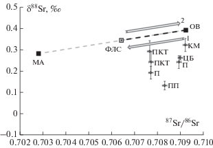 Диаграмма δ88Sr–87Sr/86Sr для карбонатных отложений в районе поля Лост Сити. Пунктир – линия смешения составов, соответствующих мантийным ультраосновным породам массива Атлантис (МА) и океанской воды (ОВ), участок пунктира, выделенный черным цветом, – смешение ФЛС и ОВ. КМ – карбонатные маты, ЦБ – карбонатный цемент серпентинитовой брекчии, ПКТ – постройки карнизного типа, П – фрагменты неизвестных построек, ПП – постройка Посейдон. Стрелки – пути изменения изотопного состава стронция: 1 – в “end member” флюиде поля Лост Сити при серпентинизации пород массива Атлантис и 2 – в гидротермальном растворе при смешении ФЛС и ОВ.