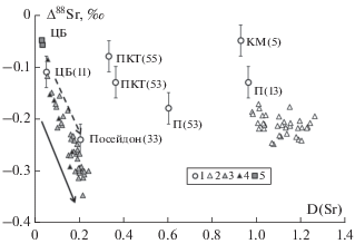 Для всех изученных образцов найденные величины Δ88Sr являются отрицательными (табл. 3), т.е. указывают на обеднение изотопом 88Sr карбонатов относительно гидротермального раствора. Согласно экспериментам (AlKhatib, Eisenhauer, 2017a, 2017b; Bohm et al., 2012), наиболее вероятной причиной подобного обеднения изотопом 88Sr по отношению к раствору является быстрое осаждение карбонатов.