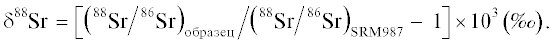 При изотопном анализе стронция методом MC-ICP-MS на масс-спектрометре Neptune (Thermo, Германия) учет масс-дискриминации проведен по отношению 90Zr/91Zr. Измерения проводились в статическом режиме с одновременной регистрацией ионных токов 83Kr+, 85Rb+, 86(Sr + Kr)+, 87(Sr + Rb)+, 88Sr+, 90Zr+ и 91Zr+. Серия для измерения каждого образца состояла из трех блоков по 20 спектров, время интегрирования спектра – 16 с. Нормализация отношения 88Sr/86Sr проводилась по экспоненциальному закону фракционирования масс (Ohno, Hirata, 2007; Крамчанинов и др., 2012; Liu et al., 2012), в измеренные отношения 88Sr/86Sr вносилась поправка на окаймляющий стандарт (Fietzke, Eisenhauer, 2006; Крамчанинов и др., 2012). Величина δ88Sr, характеризующая изотопный состав нерадиогенного стронция в образце, выражена относительно стандартного образца SRM 987 в промилле: