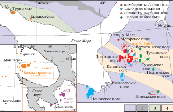 Схематическая карта, демонстрирующая распределение девонских магматических пород северо-восточной части Восточно-Европейской платформы с положением проявлений щелочно-ультрамафического магматизма, согласно (Третяченко, 2008; Арзамасцев, Ву, 2014). Возрасты провинций указаны согласно (Арзамасцев, Ву, 2014; Ларионова и др., 2016). 1–4: докембрийская кора (Bogdanova et al., 2016): 1 – архейская кора, переработанная в пределах Лапландско-Кольского коллизионного орогена; 2 – палеопротерозойские вулканические пояса и осадочные бассейны (2.50–1.95 млн лет); 3 – палеопротерозойская кора (1.83–1.82 млн лет); 4 – авлакогены, внутрикратонные бассейны (1.50–0.70 млн лет).