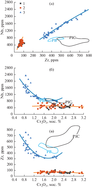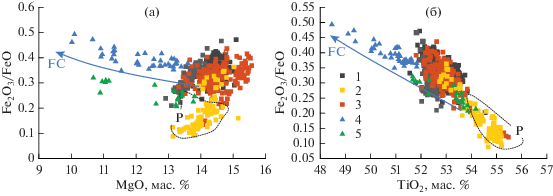 Исследования состава ильменита также расшифровывают механизмы формирования кимберлитовых магм и их последующую эволюцию. Изучение ильменита из кимберлитов Якутии (Ashchepkov et al., 2014) показало несколько этапов эволюции кимберлитового расплава – от ранних стадий, на которых в мантии происходило формирование транспортного канала для подъема кимберлитовых расплавов при их взаимодействии с литосферной мантией и образования “высокотемпературных” перидотитов, по модели (Griffin et al., 1999), до поздних стадий, где ведущую роль играли процессы фракционной кристаллизации и ассимиляции мантийного вещества. Исследования ксенолитов мантийных полимиктовых брекчий из кимберлитов Южной Африки показывают, что ильменит мог образоваться в ходе кристаллизации из некоторого расплава, обогащенного Fe-Ti-Cr (Zhang et al., 2001), и закристаллизовавшегося в мантии. Таким расплавом мог быть кимберлитовый (Pokhilenko, 2009). Позже в работах (Giuliani et al., 2013, 2014) было показано, что такими расплавами были эволюционировавшие S, Fe-Ti, K – обогащенные кимберлитовые или протокимберлитовые расплавы.