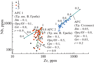 Выявленные отличия хорошо согласуются с разными моделями фракционной кристаллизации и ассимиляции формирования ильменитов из кимберлитов различных полей: (1) при формировании ильменита из безрудных кимберлитов ведущую роль играли процессы фракционной кристаллизации как самого ильменита, так и других минералов (гранат, клинопироксен, ортопироксен, оливин) из расплавов; (2) состав ильменита из высокоалмазоносных кимберлитов контролировался процессами фракционной кристаллизации минералов-мегакристов и интенсивной ассимиляции вещества литосферной мантии.