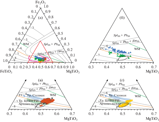 Изученные зерна ильменита из кимберлитов трубки им. В. Гриба близки по составу к ильменитам из ксенолитов мантийных перидотитов этой же трубки, с преобладающими значениями концентраций MgO от 14 до 15 мас. % (рис. 5а, 5б). Содержание Cr2O3 в них варьирует от 1.34 до 3.16 мас. % (рис. 6б) при среднем значении, равном 2.22 ± 0.41 мас. % (n = 409). Распределение фигуративных точек на диаграмме MgO–Cr2O3 (рис. 6в) согласуется с правой, “восстановительной”, ветвью “параболы Хаггерти” (Haggerty, 1975). Концентрации MnO и Al2O3 не имеют корреляционных связей с содержанием MgO и редко превышают 0.3 и 0.8 мас. % соответственно (рис. 6б, 6г). Содержание FeO в ильменитах уменьшается при увеличении MgO (рис. 6д). Концентрация Fe2O3 в ильменитах из мегакристов и перидотитовых ксенолитов, как правило, не коррелирует с концентрацией MgO, за исключением ильменита из парагенезиса с мегакристным гранатом, где содержание Fe2O3 положительно коррелирует с MgO (рис. 6е). По концентрации гейкилитового, ильменитового и гематитового миналов большинство изученных ильменитов попадают в поле 3 (рис. 7) ильменитов из включений в алмазе, а также неалмазоносных перидотитов, в том числе метасоматизированных и катаклазированных перидотитов, по классификации В.К. Гаранина (Гаранин и др., 2009).