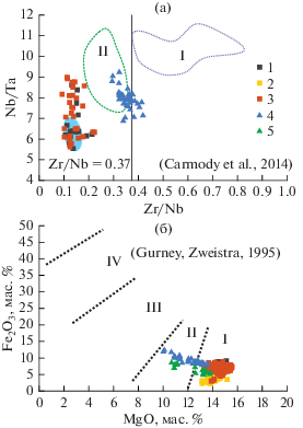 На изображениях в обратно-рассеянных электронах видно, что ильменитовые выделения в ксенолитах состоят из отдельных полигональных угловатых зерен (рис. 4ж), что может указывать на процессы перекристаллизации исходного ильменита. Размер отдельных зерен варьирует от 100 до 500 мкм. Подобные структуры характерны для ильменитов из мантийных ксенолитов, в том числе из ксенолитов полимиктовых брекчий (Zhang et al., 2001). В целом структурно-текстурные особенности изученных ксенолитов ильменитовых перидотитов (дунитов) весьма сходны с таковыми ксенолитов полимиктовых брекчий из кимберлитов провинции Кимберли, Южная Африка (Giuliani et al., 2013, 2014) и ксенолитов из трубки Удачная, Якутия (Pokhilenko, 2009). Как правило, в таких ксенолитах ильменит цементирует силикатные минералы. К сожалению, полное вторичное преобразование силикатных фаз в изученных ксенолитах не дает возможности провести детальное петрографическое сопоставление данных образцов с полимиктовыми брекчиями.