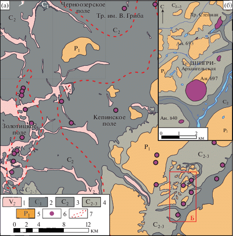 Схематическая карта центральной части Архангельской алмазоносной провинции (а) по (Третяченко, 2008) и детализированный фрагмент расположения изученных кимберлитов Кепинского поля (б) с использованием данных (Голубев и др., 2010). 1–5 – отложения платформенного чехла: 1 – терригенные отложения верхнего отдела венда (V2); 2–5 – перекрывающие кимберлитовые и родственные породы: 2–4 – терригенные и карбонатные отложения каменноугольной системы: 2 – нижнего отдела (С1), 3 – среднего отдела (С2), 4 – нерасчлененные верхнего и среднего отдела (С2–3), 5 – хемогенные и карбонатные породы нижнего отдела пермской системы (P1). 6 – положение кимберлитов и родственных пород под перекрывающими породами; 7 – контуры полей кимберлитов и родственных пород.
