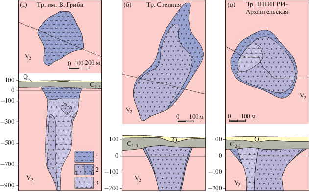 Схематические разрезы изученных трубок Архангельской алмазоносной провинции: (а) им. В. Гриба, по (Третяченко, 2008); (б) Степная, по (Кононова и др., 2007); (в) ЦНИГРИ-Архангельская, по (Голубев и др., 2010). 1 – вулканокластические, вулканогенно-осадочные и осадочные породы кратерной фации; 2, 3 – породы диатремовой фации: 2а – пирокластические кимберлиты, 2б – пирокластические кимберлиты с преобладанием ксеногенного материала, 3 – массивные пирокластические кимберлиты с высоким содержанием пирокластов (магмакластов). V2 – вмещающие терригенные толщи верхнего венда (неопротерозой), C2–3 – перекрывающие отложения среднего-верхнего карбона, Q – четвертичные отложения.