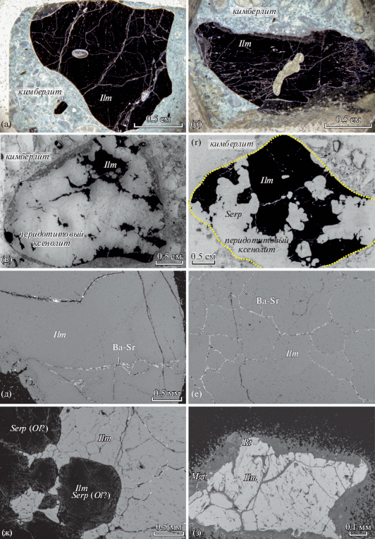 Ильменит широко распространен в ксенолитах безгранатовых перидотитов (дунитов). Часто силикатные минералы полностью изменены, превращены в агрегат серпентина, магнезиального хлорита, в меньшей степени карбоната, в связи с чем затруднительно оценить исходный состав ксенолита, однако по преобладанию серпентина можно предположить, что исходно ксенолиты имели дунитовый или гарцбургитовый состав. Ильменит имеет неправильную форму, образует заливообразные выделения, узкие длинные апофизы, внедряющиеся по границам зерен силикатных минералов (рис. 4в, 4г, 4ж). В ильмените присутствуют многочисленные включения полностью серпентинизированных зерен, которые по форме соответствуют оливину (рис. 4ж). Содержание ильменита в различных ксенолитах может достигать 70 об. %.