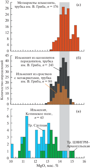 Отметим, что на диаграмме MgO–Cr2O3 составы изученных ильменитов из двух полей имеют область перекрытия с диапазоном концентраций MgO от 13 до 14 мас. % и Cr2O3 от 1.5 до 2.0 мас. % (рис. 6в). Данная область соответствует составу ильменита из мантийных ксенолитов типа PIC и ксенолитов полимиктовых брекчий из кимберлитов провинции Кимберли, Южная Африка (Giuliani et al., 2013; Fitzpayne et al., 2018b). В целом составы изученных ильменитов из кимберлитов Кепинского поля перекрываются с составами ильменита из промежуточных коллекторов раннекаменноугольного возраста, расположенных вблизи кимберлитов Золотицкого поля ААП (Afanasiev et al., 2013).