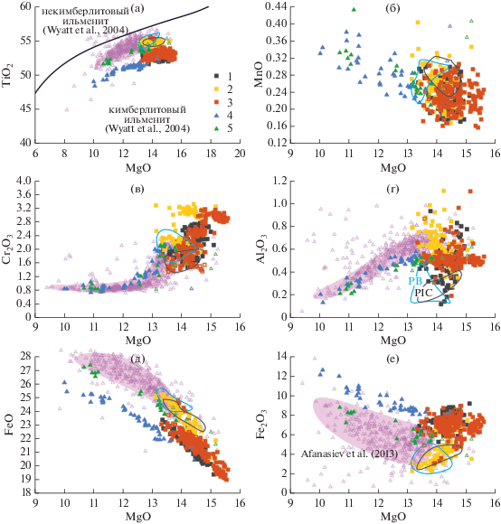 Распределение концентраций (мас. %) TiO2, MnO, Cr2O3, Al2O3, FeO, Fe2O3 относительно MgO. 1–3 – ильмениты из кимберлитов трубки им. В. Гриба: 1 – из ксенолитов мантийных перидотитов, 2 – из сростков с минералами (гранат, ортопироксен) низко-Cr мегакристной ассоциации (Peresetskaya et al., 2019), 3 – мегакристы и их фрагменты; 4, 5 – ильмениты из кимберлитов трубок Кепинского поля: 4 – Степная, 5 – ЦНИГРИ-Архангельская. На рис. (а) показана линия, разделяющая поля кимберлитовых и некимберлитовых ильменитов, согласно (Wyatt et al., 2004). Незалитые значки – составы ильменита, которые по петрографическим наблюдениям могли находиться в равновесии с кимберлитовым расплавом. Поля ильменитов из ксенолитов типа PIC (черный контур “PIC”) и ксенолитов полимиктовых брекчий (голубой контур “PB”) из кимберлитов провинции Кимберли, Южная Африка (Giuliani et al., 2013; Fitzpayne et al., 2018b). Розовым полем с треугольниками показаны составы ильменита из промежуточных коллекторов раннекаменноугольного возраста, расположенных вблизи кимберлитов Золотицкого поля (Afanasiev et al., 2013).