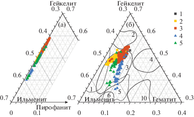 Тройные диаграммы ильменит–гейкелит–пирофанит (а) и ильменит–гейкелит–гематит (б) для изученных ильменитов. 1–3 – ильмениты из кимберлитов трубки им. В. Гриба: 1 – из ксенолитов мантийных перидотитов, 2 – из сростков с минералами (гранат, ортопироксен) низко-Cr мегакристной ассоциации (Peresetskaya et al., 2019), 3 – мегакристы и их фрагменты; 4, 5 – ильмениты из кимберлитов трубок Кепинского поля: 4 – Степная, 5 – ЦНИГРИ-Архангельская. На рис. (б) поля ильменитов, согласно (Гаранин и др., 2009): 1 – включений в алмазах и алмазоносных перидотитов, 2 – алмазоносных лерцолитов и метасоматизированных перидотитов, 3 – включений в алмазе, неалмазоносных перидотитов, в том числе метасоматизированных и катаклазированных перидотитов, 4 – неалмазоносных перидотитов и энстатитов, 5 – неалмазоносных лерцолитов с графической структурой (ильменит-клинопироксеновые сростки), 6 – неалмазоносных пироксенитов, 10 – включений в зональных гранатах, сростков с ними и неалмазоносных перидотитов.