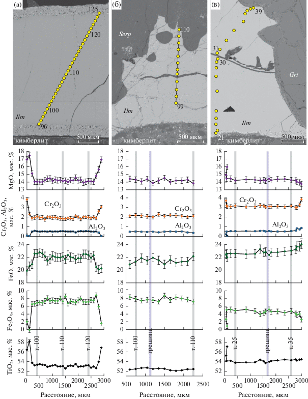 Профили состава ильменита (Ilm): (а) – на контакте ильменита с кимберлитом, обр. ГР1-634-5; (б) – на контакте ильменита с серпентинизированными минералами перидотита (Serp), обр. ГР1-536-1; (в) – на контакте ильменита с высоко-Ti гранатом (Grt) из ассоциации минералов-мегакристов, обр. ГР1-624-5. Фотографии в обратно-рассеянных электронах.