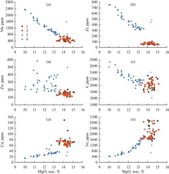Элементы-примеси. Концентрации редких элементов, таких как Nb, Ta, Zr, Ni, Zn, V, широко варьируют в изученных ильменитах и коррелируют с содержанием MgO (рис. 9): при понижении MgO концентрации Nb, Ta, Zr, Zn, V увеличиваются, тогда как концентрация Ni – уменьшается. Подобное поведение элементов-примесей в изученных ильменитах в целом сопоставимо с поведением данных элементов в Mg-ильменитах других мировых кимберлитовых проявлений (Moore et al., 1992; Ashchepkov et al., 2014; Castillo-Oliver et al., 2017). Отметим, что некоторые ильмениты из трубки им. В. Гриба характеризуются повышенными концентрациями высокозарядных элементов, на фоне пониженной Ni и высокой MgO (рис. 9), что отражает их переуравновешивание с кимберлитовым расплавом на поздних стадиях формирования кимберлитовых трубок (Castillo-Oliver et al., 2017).