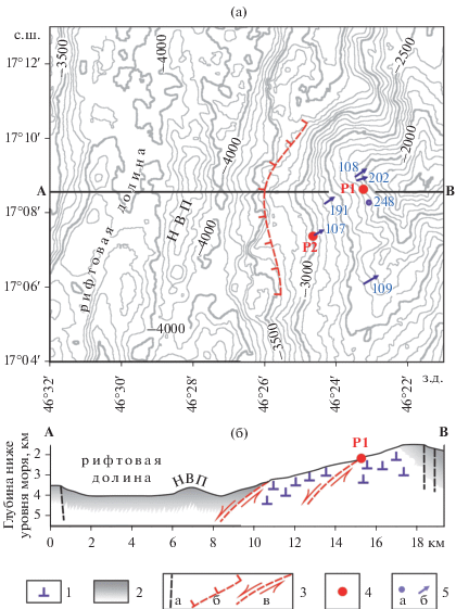 Батиметрическая карта (а) и разрез по линии А–В (б) с интерпретацией геологической структуры САХ в широтном интервале 17°04′–17°13′ с.ш. 1 – породы габбро-ультрабазитовой ассоциации; 2 – базальты; 3 – предполагаемые разрывные нарушения (а – субвертикальные малоамплитудные разломы на разрезе, б, в – высокоамплитудные разломы растяжения на карте и в разрезе соответственно); 4 – гидротермальные поля Победа-1 и -2 (P1 и P2 соответственно); 5 – станции опробования (а – телегрейфером, б – драгой), где отобраны изученные образцы перидотитов (табл. 1). Остальные 21 станция не показаны. НВП – неовулканическое поднятие (магматический центр спрединга). На разрезе вертикальный масштаб равен горизонтальному.