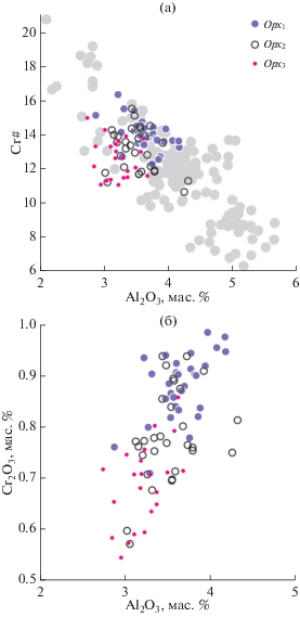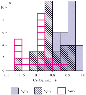 Независимо от выделяемых нами разновидностей (Opx1, 2, 3), намечается общий тренд одновременного снижения концентраций Al и Cr (рис. 2б), соответствующий постепенному очищению Opx2, 3 от примесей Cr и Al по сравнению с Opx1. Эта общая закономерность осложняется заметным перекрытием составов. В частности, около половины составов центральных частей крупных зерен также оказываются относительно обедненными Cr и Al. Тем не менее по содержанию Cr2O3 выделяемые разновидности ортопироксена имеют более или менее обособленные статистические максимумы (рис. 3).