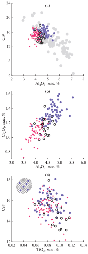 Клинопироксен. Значения Mg# в клинопироксене находятся в диапазоне от 90.3 до 93.5 без каких-либо закономерных вариаций. По соотношению Al и Cr в клинопироксене проявляются такие же закономерности, как и в ортопироксене. Как и в случае с ортопироксеном изучаемые клинопироксены соответствуют степени деплетирования выше среднего на общем фоне абиссальных перидотитов (рис. 4а). В отличие от ортопироксенов разновидности Cpx1, 2, 3 на диаграмме Al2O3–Cr2O3 более обособлены (рис. 4б). По содержанию TiO2 разновидности Cpx1, 2, 3 значительно перекрываются, хотя общая тенденция возрастания концентрации TiO2 со снижением Cr# намечается (рис. 4в).