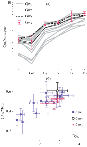 Вариации состава клинопироксена по редким несовместимым элементам: (а) спектры элементов-примесей. $Cpx_{{\text{1}}}^{*}$ – составы, используемые в дальнейших расчетах; Cpx3 – среднее из пяти локальных анализов с интервалами погрешности (1σ); (б) корреляция содержания Dy и отношения Dy/Yb с интервалами погрешности (1σ). Концентрации элементов нормированы к хондриту С1 (Sun, McDonough, 1989).