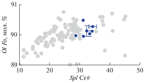 Диаграмма Cr# шпинели и содержания форстеритового минала в ассоциирующем оливине. Интервалы погрешности (1σ) показаны, если они выходят за пределы условного знака. Серым цветом показаны ассоциации абиссальных перидотитов медленно- и сверхмедленно-спрединговых обстановок, по данным (Michael, Bonatti, 1985; Dick, 1989; Komor et al., 1990; Ghose et al., 1996; Stephens et al., 1997; Brunelli et al., 2003).