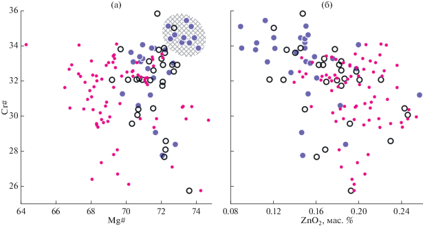 Различия между Spl1, Spl2 и Spl3 можно видеть в вариациях состава шпинели по Cr# и Mg# (рис. 7а). Переход от Spl1 к Spl2, 3 в целом сопровождается одновременным снижением Mg# и Cr#. Эта корреляция объяснима регрессивным переуравновешиванием с пироксенами при участии интерстиционного расплава в результате ограничения растворимости компонента Mg(Al,Cr)AlSiO6 в пироксенах и обменных реакций Mg-Fe силикат/шпинель. Вместе с тем составы Spl2 и Spl3 с наименьшими значениями Mg# и Cr# (наиболее удаленные от основного поля составов Spl1) в целом обнаруживают обратную корреляцию Cr# и Mg#, что можно объяснить дальнейшим регрессивным переуравновешиванием силикат/шпинель без участия расплава и без изменения хромистости. Это обусловлено более высоким химическим сродством шпинелей с более высоким значением Cr# к Fe2+ относительно Mg (Аранович, Косякова, 1980; Аранович, 1991). Наиболее высокие значения Cr# и Mg# сохраняются в обособленном поле Spl1, куда попадает один анализ Spl2 и ни одного анализа Spl3 (рис. 7а). По-видимому, это поле, обозначенное на рис. 7а штриховкой, наиболее близко к первичному составу реститовых шпинелей с хромистостью 33.8–35.5. Соответствующая степень фракционного плавления составляет приблизительно 13–14%, согласно эмпирической формуле (Hellebrand et al., 2001). Другой важной особенностью вариаций состава шпинелей является общее относительное обогащение ZnO при переходе от Spl1 к Spl2, 3 (рис. 7б).